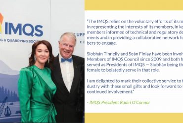 At the Irish Mining and Quarrying Society (IMQS) Annual Dinner Dance held in the Hodson Bay Hotel, Athlone on 15th November, IMQS President Ruairí O’Connor paid a wonderful tribute to two outstanding contributors to the Society, our own Siobhan Tinne …