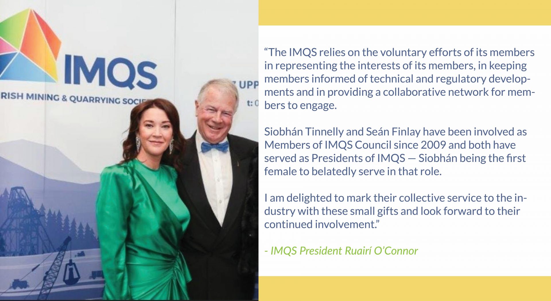 At the Irish Mining and Quarrying Society (IMQS) Annual Dinner Dance held in the Hodson Bay Hotel, Athlone on 15th November, IMQS President Ruairí O’Connor paid a wonderful tribute to two outstanding contributors to the Society, our own Siobhan Tinnelly, ...