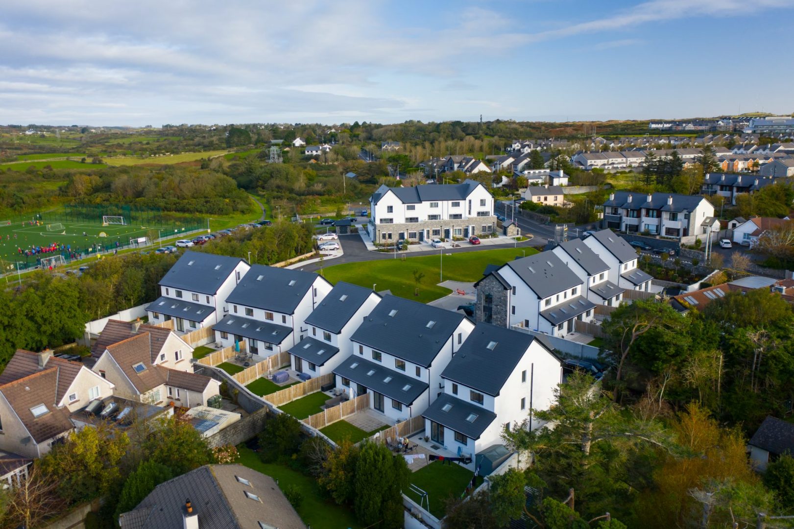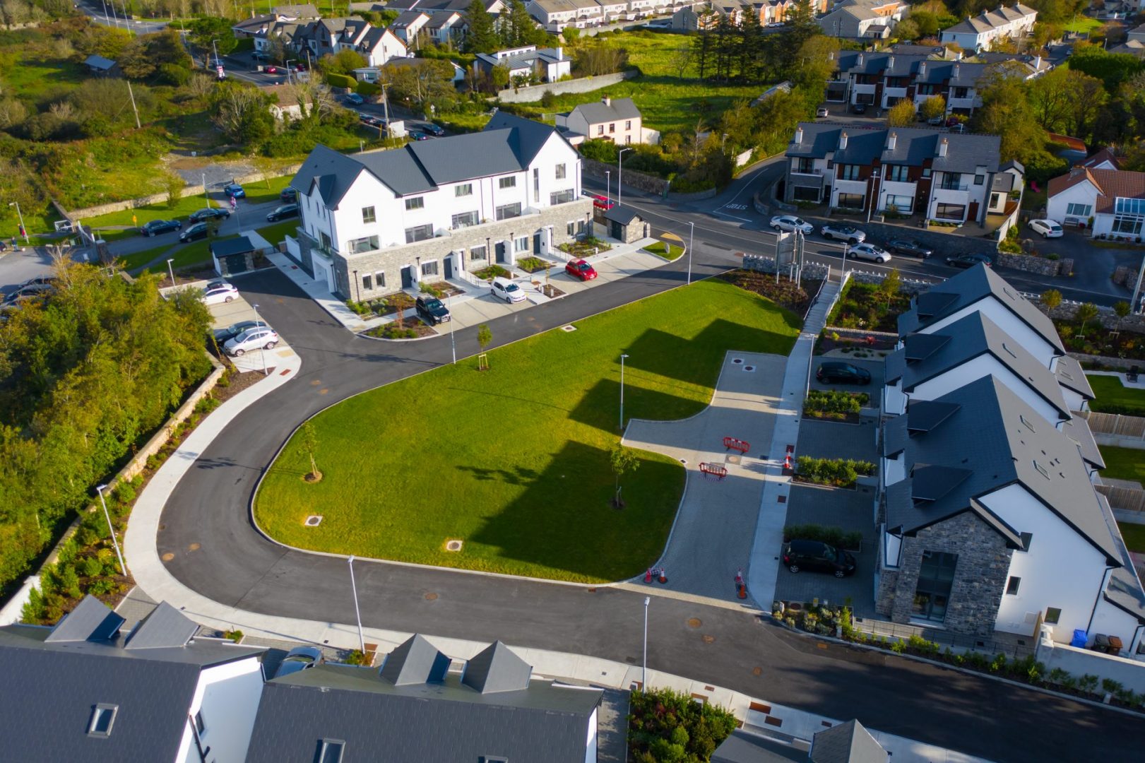 The site access and internal road network was designed to comply with DMURS and the requirements of Galway City Council. The road and house levels set so as to ensure a balance of cut and fill within the site while keeping the depth of rock breaking to a minimum. Full BCAR ancillary certification was provided for all structural and civil elements of the project.