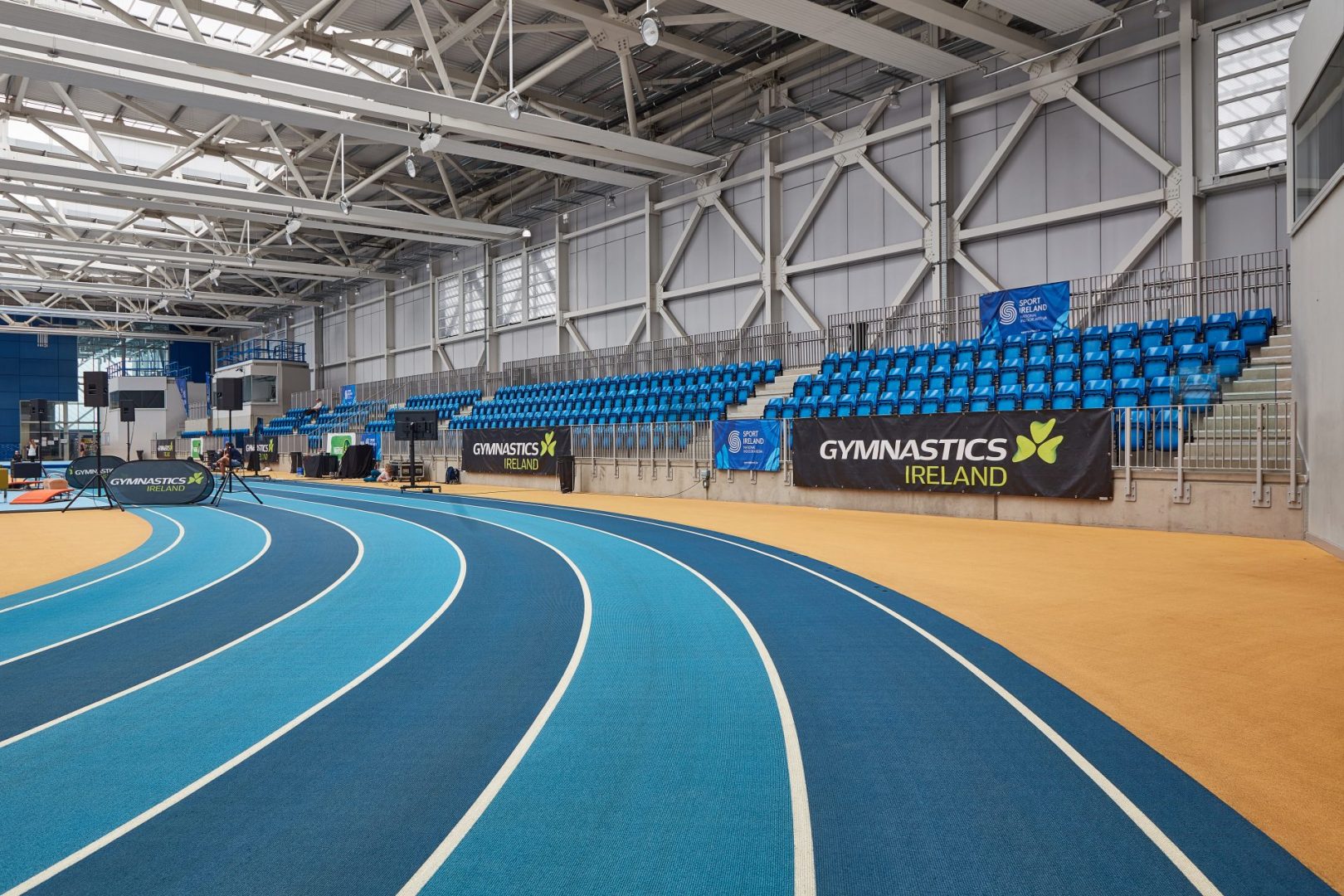 In terms of the NIA’s design and construction details, this venue is truly unique in Ireland. The NGTC caters to all gymnastics disciplines with permanent equipment installations, foam pits and floor area, as well as a viewing gallery. The NIATC alone boasts a 200m hydraulically operated track; 60m and 110m sprint tracks; throw, jump and pole-vault areas as well as permanent seating for 400 spectators (which can be increased to 1,900 or higher for non-track events).